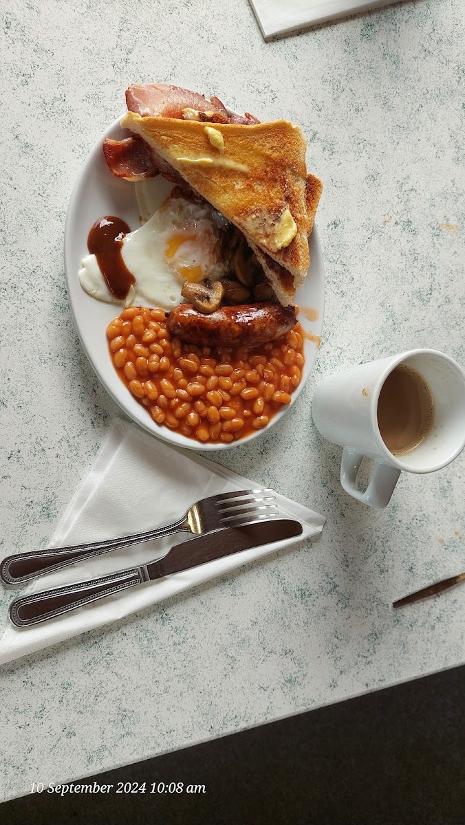 Fantastic breakfast with proper Lincolnshire sausage my friends and I all had the 'large catch' and thourghly enjoyed it Breakfast is served all day with a lunch menu starting at 11 am The cafe is bright clean and airy with outdoor seating as well Plenty of parking and great value for money